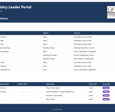 GiftMatch360 is here to help. Our platform simplifies the process of identifying the spiritual gifts within your congregation, ensuring that each individual is empowered to fulfill their God-given potential. Whether you're seeking to engage volunteers for specific ministries, strengthen your leadership teams, or connect people with opportunities to serve, GiftMatch360 provides a comprehensive, easy-to-use solution that supports your church’s mission.