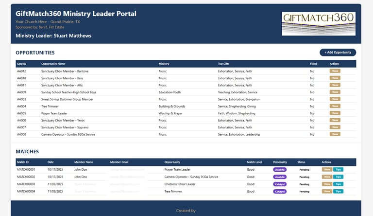 GiftMatch360 platform's proprietary matching system to automatically alert Ministry Leaders of matches for their opportunities. *Patent Pending